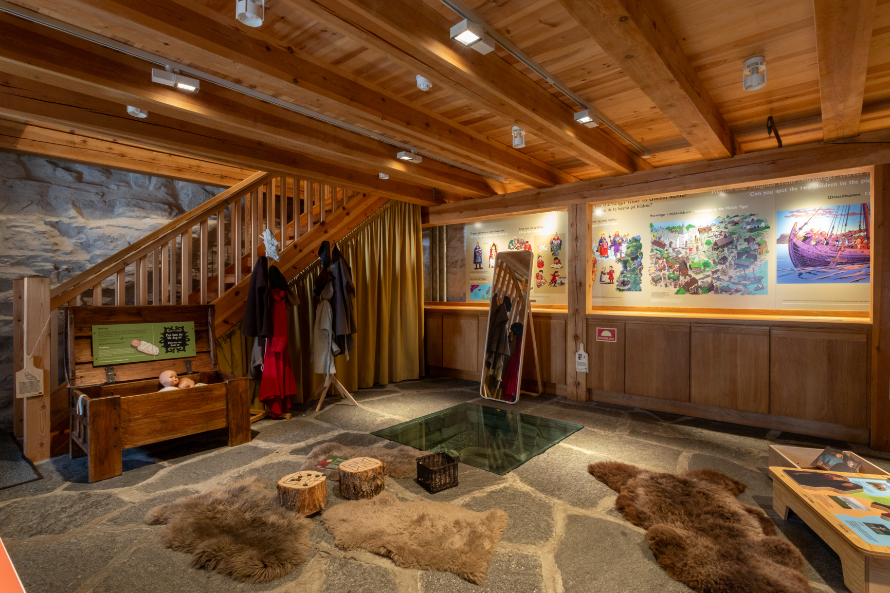 Utstillingen er laget av Norsk Barnemuseum, og er tilpasset barnefamilier. Gjennom utstillingen følger vi Kristin og Magnus på 10 år som bor i Stavanger i middelalderen. Kristin er en fattig tjenestejente mens Magnus er en rik prestesønn. Gjennom film, tegneserier og aktiviteter får publikum et innblikk i hvordan barns liv kunne være på 1200-tallet. I underetasjen finnes flere kjekke aktiviteter og leker for barn. Her kan de kle seg ut, spille spill fra middelalderen, prøve å svøpe en babydukke, og mye mer.